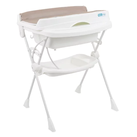 O suporte possui quase um metro de altura, tamanho ideal para que a mamãe mantenha a postura e não tenha dor nas costas. Feito com travas de arco, é firme e seguro. A banheira é rígida, não dobra e nem deforma com a quantidade de água, e possui um redutor de profundidade para recém-nascidos removível que mantém o bebê sentado. O porta-tolha mantém a toalha por perto, para que não haja dificuldades ao retirar o bebê da banheira. Na parte inferior há uma bandeja para armazenar os acessórios que a mamãe vai precisar para dar banho na criança, mantendo-os organizados e sempre à mão. Possui um amplo tampo de plástico com trocador acolchoado onde a mamãe pode secar e vestir o bebê confortavelmente. Acompanha mangueira para escoar a água da banheira sem precisar retirá-la suporte.